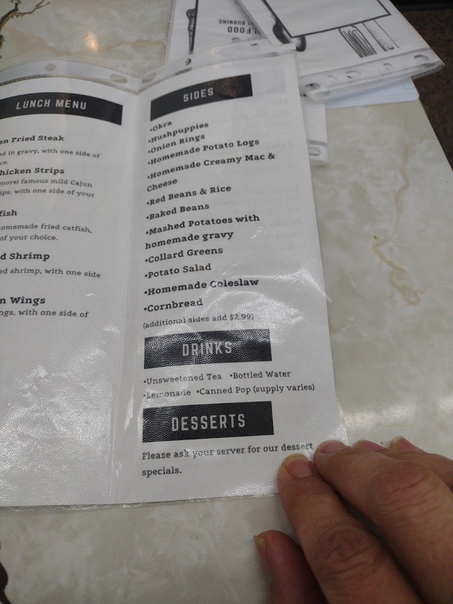 If you're in the mood for a quick bite, the Single Items section offers options like Cajun Strips, Single Catfish Strip, and Single Shrimp-perfect for those craving a small yet satisfying meal. Additionally, the restaurant serves refreshing Lemonade and Tea, which are ideal for quenching your thirst.