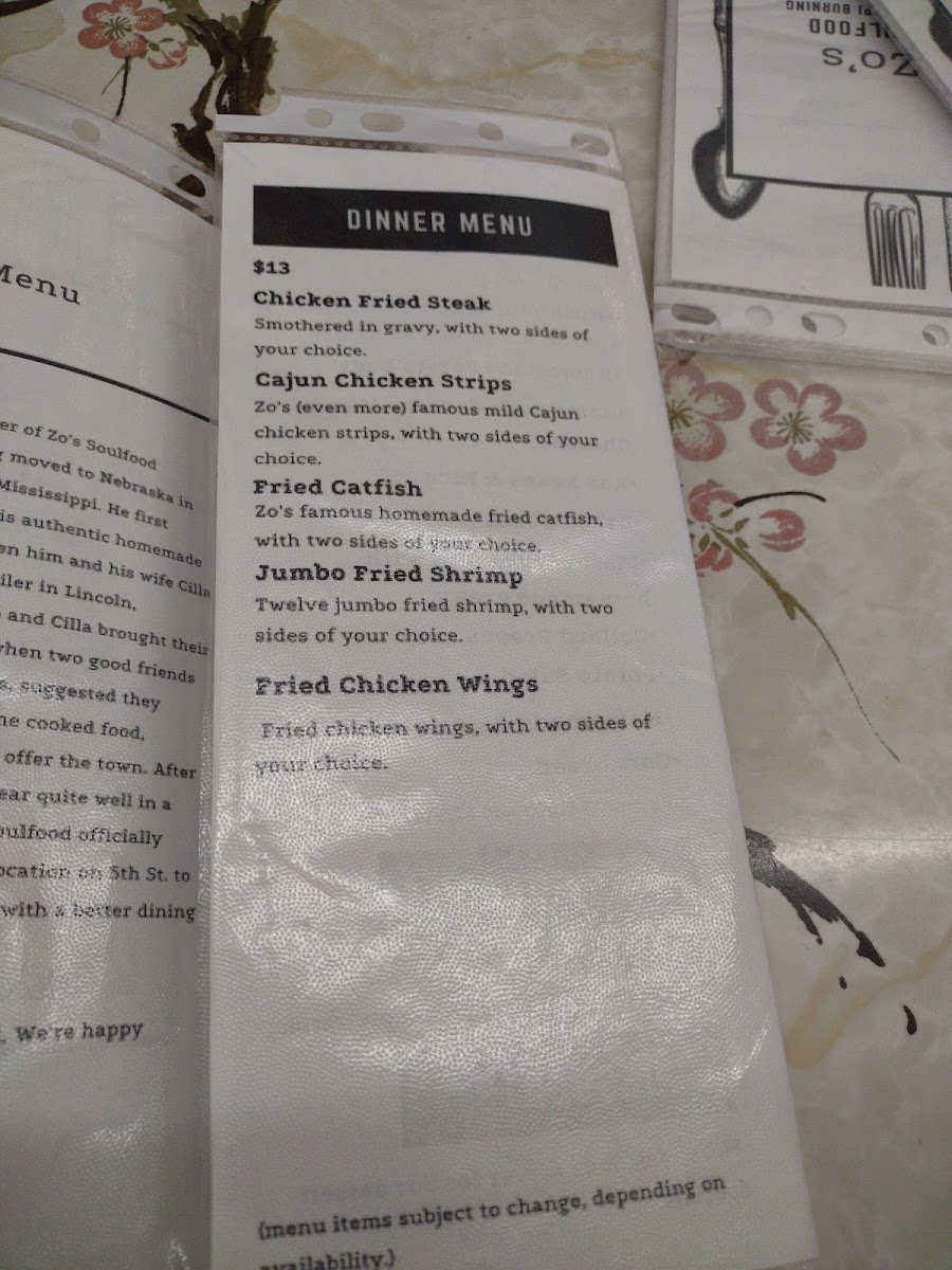 Zo’s also features a Lunch Menu with satisfying dishes like the 2 Pc Cajun Chicken Strips, Small Chicken Fried Steak, Baked Pork Chops, Fried Catfish, and Jumbo Fried Shrimp. These hearty options are perfect for a midday feast.